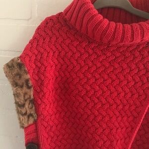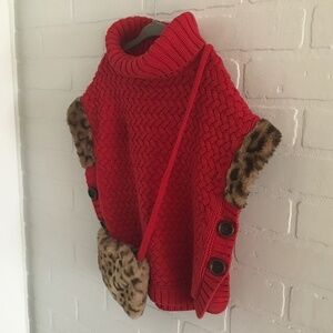 Kids sweater. Red chunky cable knit. Faux fur leopard print trim. Short sleeve. Rounded hem with side slits. Perfect to wear over another shirt.