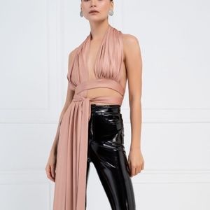 This gorgeous backless top can be worn with wide leg or tight pants or shorts. The material is stretchy with a slight shimmer. Ankle length.