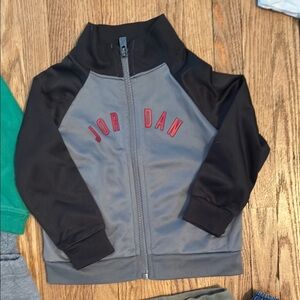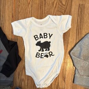 A collection of baby clothes including tops, pants, and a hoodie. Features green, gray, and black colors. All in great shape. Bundle and save