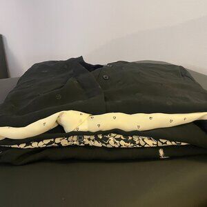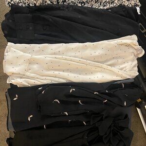Assorted Blouses. In order, left to right. Flower button down, sheer black button down with black velvety polkadots, white with black hearts button down, black with white feathers, black sheer tank with tie in the back. All fit M/L. Sold separately.