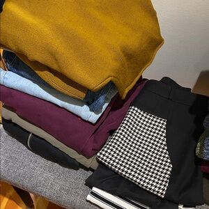 A bundle of assorted clothing in various colors including mustard, purple, black, and gray. Perfect for diverse styling options.