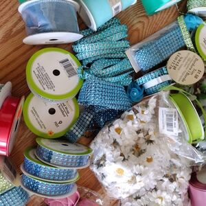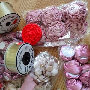 A vibrant collection of craft ribbons and decorative flowers. Includes shades of pink, green, blue, and gold.