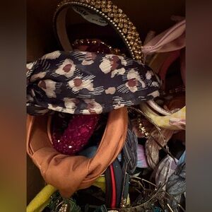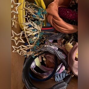 A LARGE vibrant collection of hair accessories including headbands, hair bands and scrunchies and elastics. Features a variety of colors and patterns.