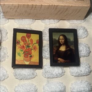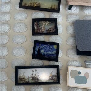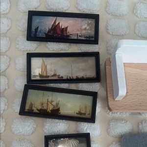 A collection of assorted home decor items including frames, wall art, and decorative pieces. Features natural wood tones and colorful accents.