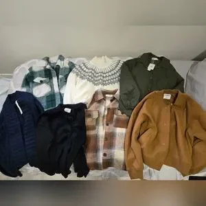 A collection of stylish jackets and sweaters in various colors. Includes plaid, patterned, and solid designs. Sizes ranges from small to medium. There's new with tag items, new without tag items and 2 gently worn.