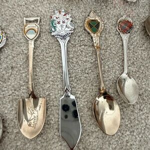Collection of assorted souvenir spoons. Features unique designs and emblems.