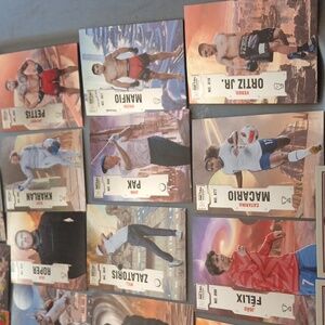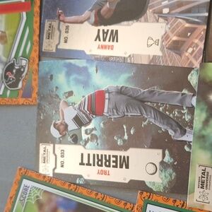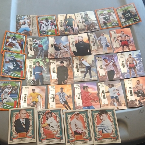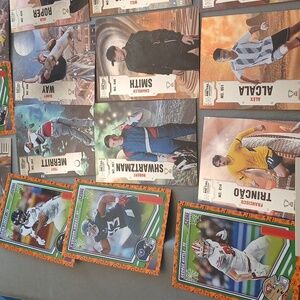 A collection of assorted sports trading cards featuring various athletes. Includes vibrant designs and action shots.