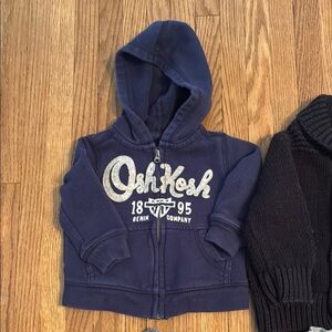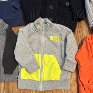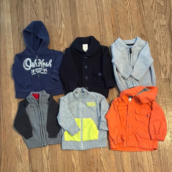 Experience the perfect blend of comfort and style with this assortment of sweaters and a jacket. Its vibrant color combination adds a touch of fun to any wardrobe. All size 6-12 months.