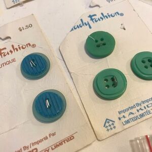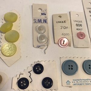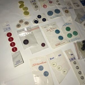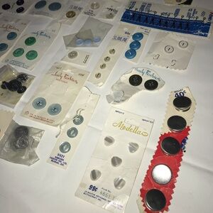 Collection of assorted vintage buttons in various colours, sizes and styles. Includes hook and eye closures and small snaps.