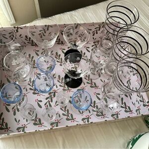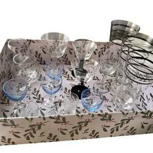 Beautiful glassware set featuring elegant designs. Includes pieces with blue and black accents. Perfect for entertaining.