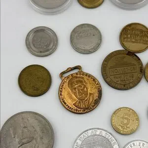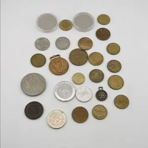 A collection of assorted vintage coins in various sizes and designs. Features silver, gold, and bronze tones.
