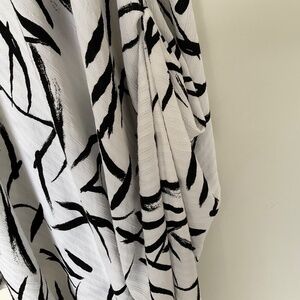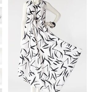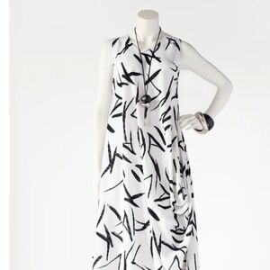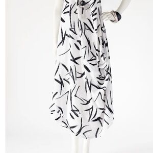 Elegant asymmetrical dress featuring a striking black and white pattern. Perfect for any occasion.