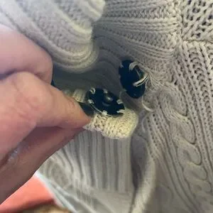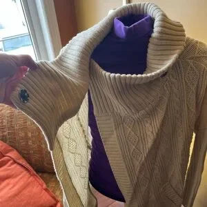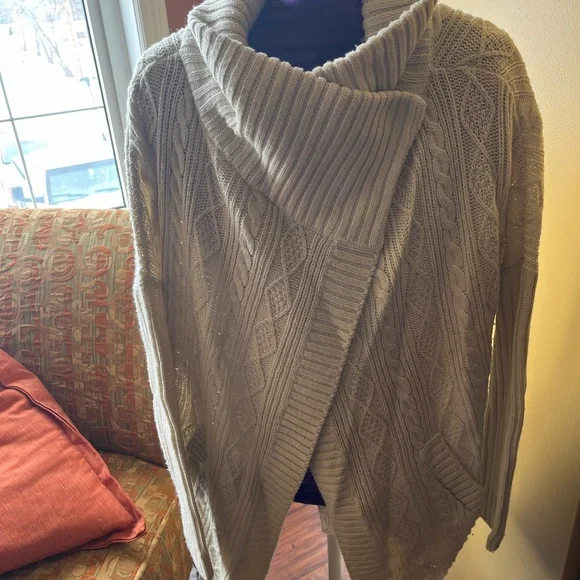 This cream cardigan showcases a stylish asymmetrical wrap design with a wide, draped collar for a chic look. The ribbed knit texture adds depth and elegance, while its open style offers versatile layering options. Long sleeves and an extended length ensure warmth and comfort. Very minimal signs of wear.
