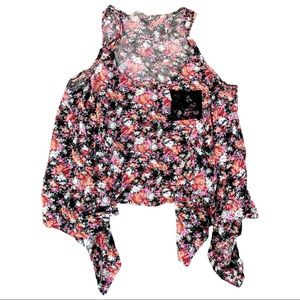 Floral and very comfortable - this shirt has a black laced pocket giving the front of the top lots of character? And to be quite honest, this is one of the most comfy shirts I’ve ever worn. I especially love it because I was able to wear it during the day casually, and then pair with a high skirt or some torn jeans for a going-out look. The shirt is in great used condition.