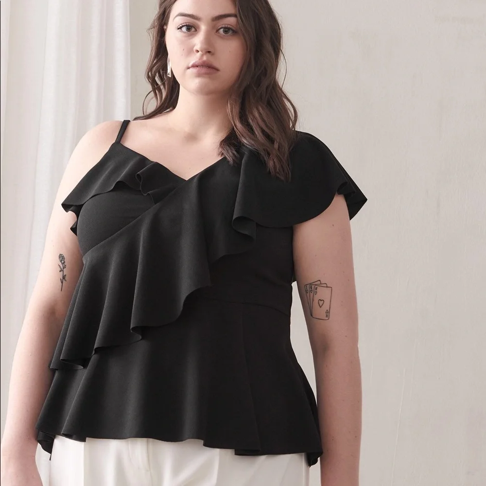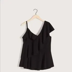Knit crepe fabric. Peplum with ruffle layer. V neckline with spaghetti strap/off shoulder.
