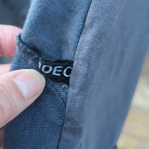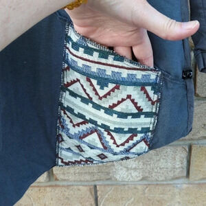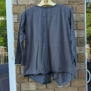 I bought this for myself and only ever wore it a couple of times. My loss is your gain. This top features a variety of fabrics, external seams and an irregular hemline.