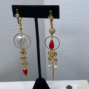 Hand made, One of a kind, unique asymmetrical earrings, made of natural irregular shape pearl and natural coral bead. Premium quality, hypoallergenic finding with CZ.