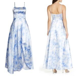 Rewrite the rules in this chic mikado ballgown awash in watercolor flowers and styled with adjustable straps and an asymmetrical high/low hem for a pop of wow.