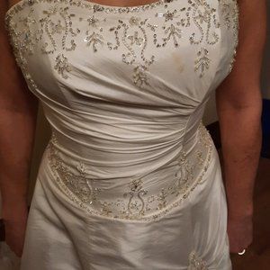 Princess style wedding dress in satin and chiffon in soft white. Brand: Atelier Diagonale. Purchased at David Bridal. Size 8.