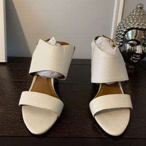 Gorgeous white leather sandals with original black and tan block heels. In perfect condition (worn twice). Gold hardware, elastic strap. Made in Brazil shoe quality.