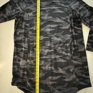 Ridiculously comfortable sweatshirt dress with side pockets, and a zip pocket on the sleeve. Measurements in photos.