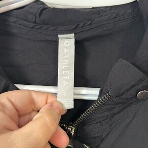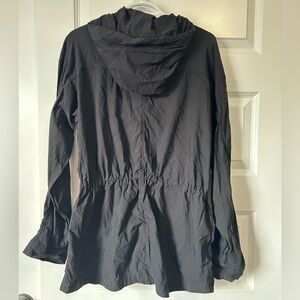Sleek black utility jacket. Features a hood and multiple pockets. Ideal for layering.