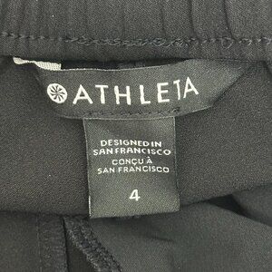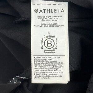 Athleta Endeavor Jogger Pants Black. High rise. Elastic and drawstring waist. Darts down front. Jogger ankles. Zip slash pockets on front.Two back pockets. Materials: 86% Polyester, 14% Spandex/Elastane. Quite a bit of stretch. Excellent condition. No known flaws.
