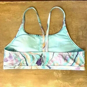 This bra is lightweight and in excellent used condition. It's a beautiful swirl pattern, had both foam inserts and the skinny racer back strap style is slim and streamlined.