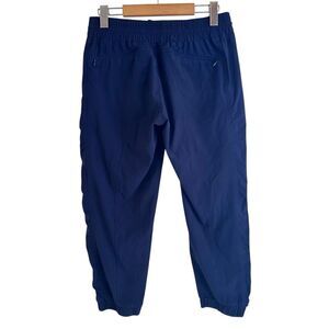 In excellent condition. Athleta La Viva navy blue, light weight cropped pant. Stylish and comfortable navy cropped pants perfect for casual outings. Features an adjustable drawstring for a custom fit. and zippered pockets. These are great pants for hiking, travel or almost any outdoor activity. Flat lay measurements: 13" waist, 8" rise, 23" inseam.