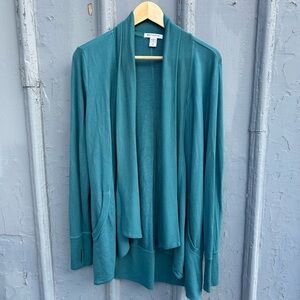 Drape front hose soft modal cardigan top. Pockets at each side.