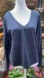 Classic Athleta long sleeve V-neck top in a versatile navy blue. Designed in San Francisco and made in Guatemala. Features a soft, lightweight knit with some stretch for comfort and ease of movement. A great layering piece for casual wear, lounging, or light activity.