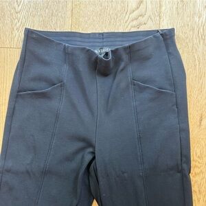 zip at side of waist, seam running down front of legs, pockets at front, zip pockets on back. high elastic waist. Great for hiking or everyday.