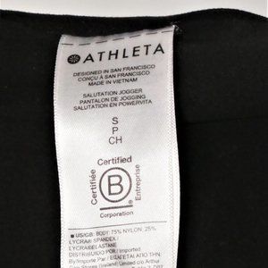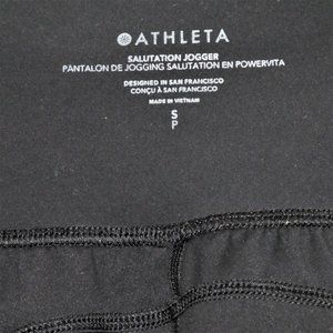 ATHLETA Solution Jogger Size Small black. In excellent pre-owned condition, no visible peels, pre-washed. Made with buttery soft powervita fabric, semi-fitted with high rise waistband that holds you in, cuffs at the bottom, two inside patch pockets. Smoke and pet free home.