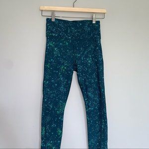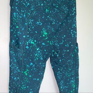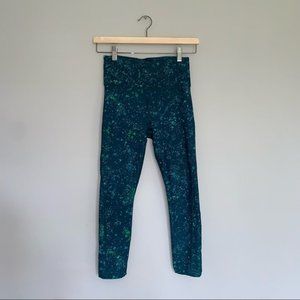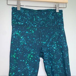 athleta ultimate stash pocket leggings, women’s xs leggings, stash pocket crop tights, high rise athleta leggings, teal splatter leggings, compression workout leggings, athleta activewear, gym yoga leggings