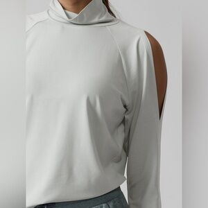Athleta long sleeve soft cold shoulder solid turtleneck top on grey. Size M