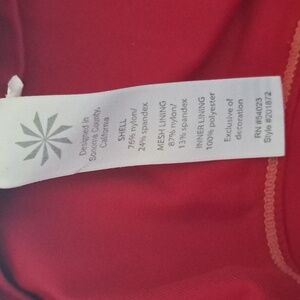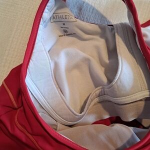 Athleta women's red size medium racer back tank top, has built in bra, white is dingy from being washed with dark clothing, its on the inside so hidden, pocket on the back as well as a zippered pouch