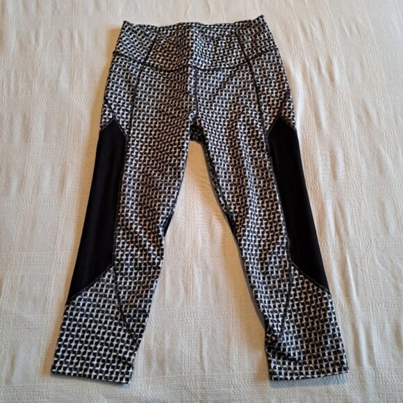 Athleta women's size Medium black, gray & white cropped leggings, block pattern, back waisted zippered pocket, drawstring in the front, the solid black areas are a soft mesh