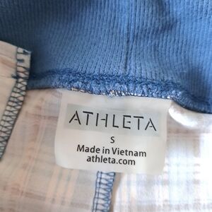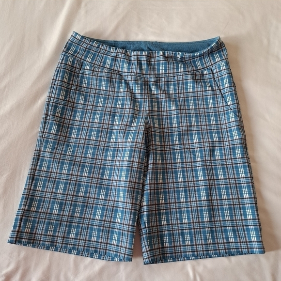 Athleta womens plaid shorts size small, soft waisted, 2 front, 1 back zippered pocket, dark teal, bkack & white, no defects