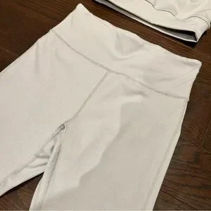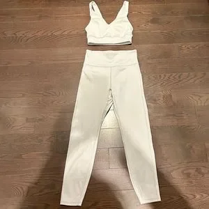 This set is like new, excellent quality worn perhaps 2x. Light grey size small sports bra (easily fits D cup) plus medium size cropped leggings.