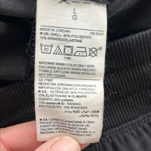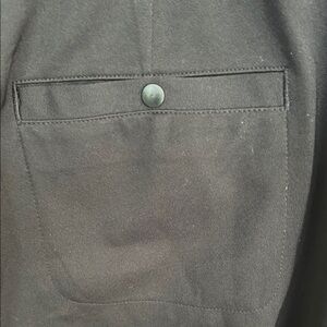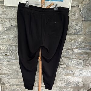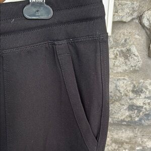 Comfortable black jogger pants. Elastic waistband with ties. Side pockets. One back pocket with snap button. Perfect for workouts or casual wear. Very good condition. Measurements in pics: waist and length