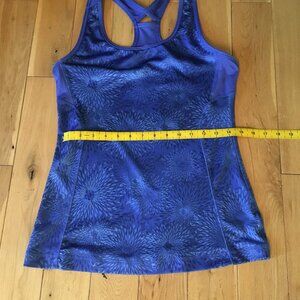 Fair preowned condition, blue fitted racerback tank top by Athletic Works featuring a seamless diamond burst pattern throughout in light blue and dark blue. This piece is in really good condition with an interesting integration of shoulders to back. However, the information tag/comp has been cut out, hence the 'fair' grading. Otherwise, a very nice thicker material workout top.