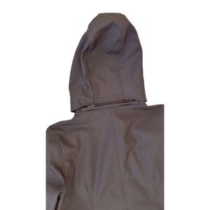 Stylish brown pea coat by Athletic Works. Features a hood and front zipper. Perfect for cool weather. Fleece lined. Detachable hood. Reversible front zipper. Mushroom color.