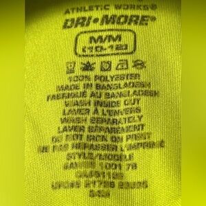 Dri More. Size 10/12. 100% polyester. Yellow. “Grace Under Pressure” large print on front. Good used condition. Worn regularly.