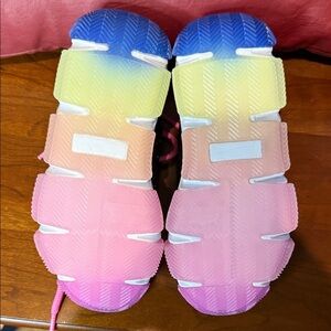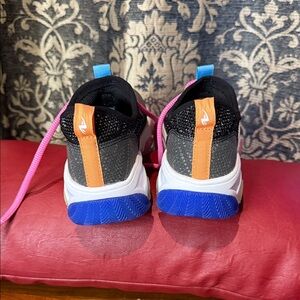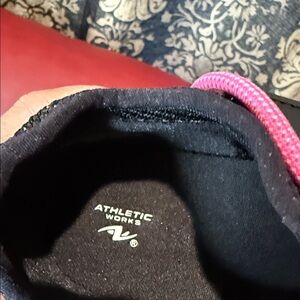 Stylish kids sneakers by Athletic Works. Black upper with vibrant pink laces. Colorful sole accents for a fun look. Comfortable and trendy. Scuff proof soles, school approved. Back to school.