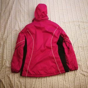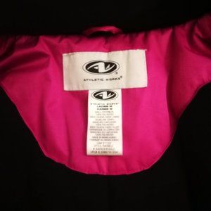 Women's Athletic Works winter jacket. Size medium. Pink with black accents and black inside lining. Pull straps on bottom hem to tighten around the waist for extra wind protection. Made of 100% polyester.