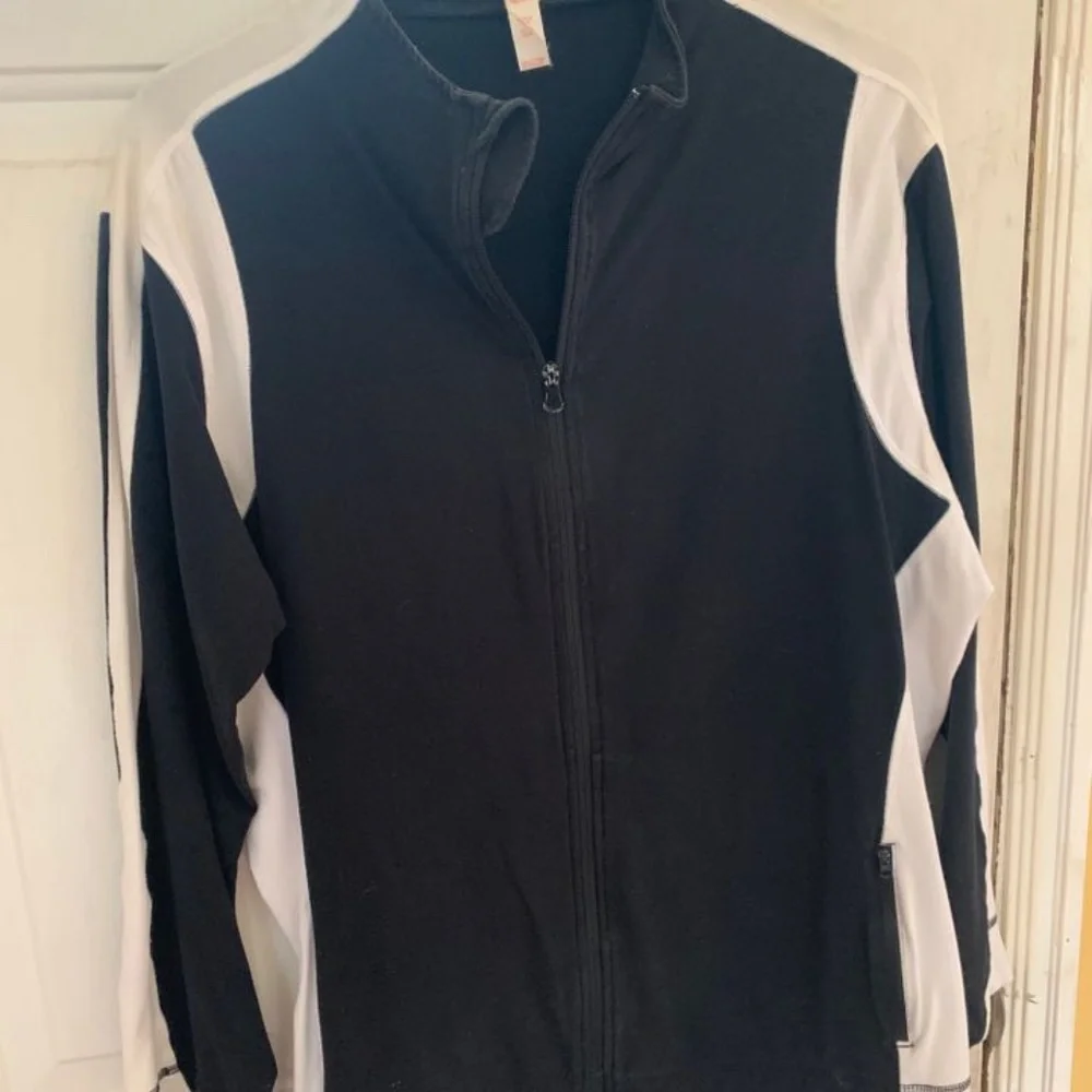Knit weight really sharp with nice flattering b/w contrast detail. 95% cotton 5% spandex . Zip pockets