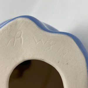 Vintage Atlantic Mold hand painted, signed and dated 1977 Christmas glazed ceramic figurine of a caroler girl woman lady wearing a blue coat with white trim, blue dress and brown gloves.