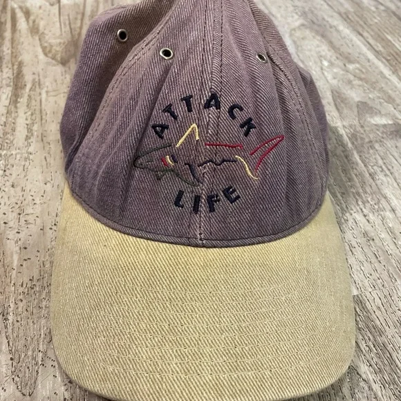 Worn but still lots of life, adjustable baseball cap featuring a friendly little shark and the words, “attack life.”