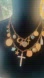 Elegant gold tone charm two layer necklace featuring 🧿 flower, leaf, glass 💙 a cross, moon and other charms featuring semi precious stone accents. Perfect for adding a touch of sophistication to any outfit. Excellent condition no tarnish no lead.