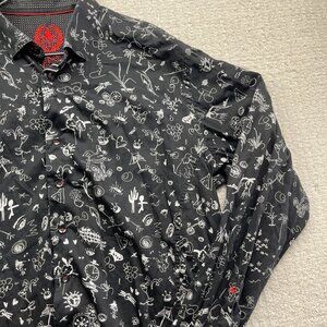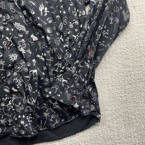 Au Noir Black Button Down Shirt Graphic Doodle Drawing AOP Men Size 6 Casual
